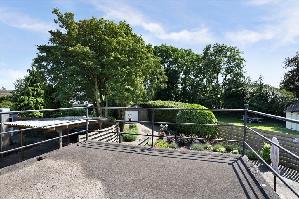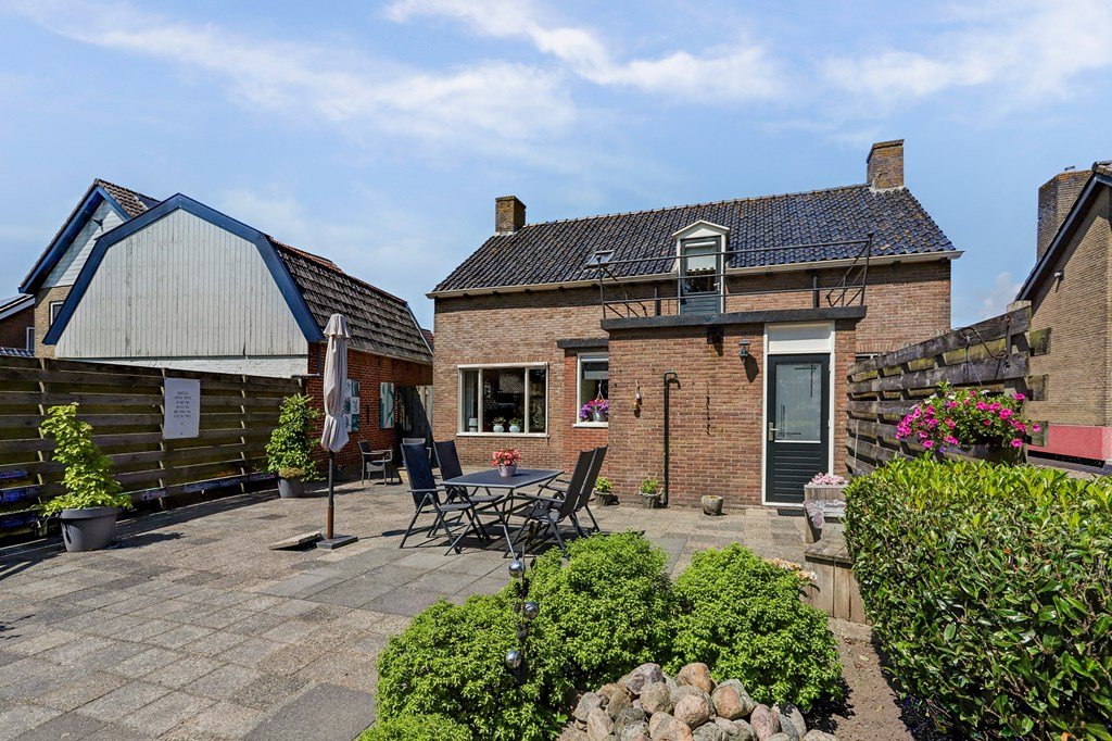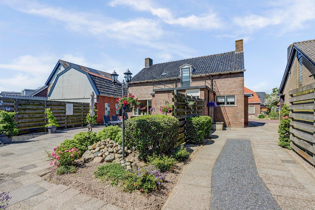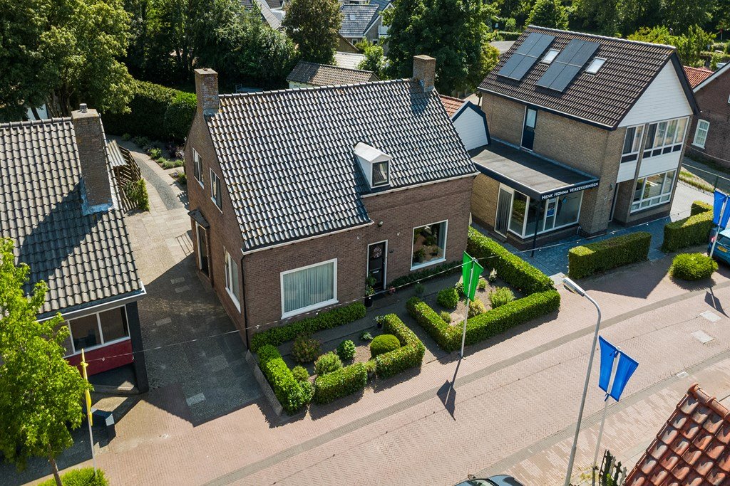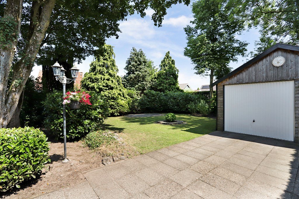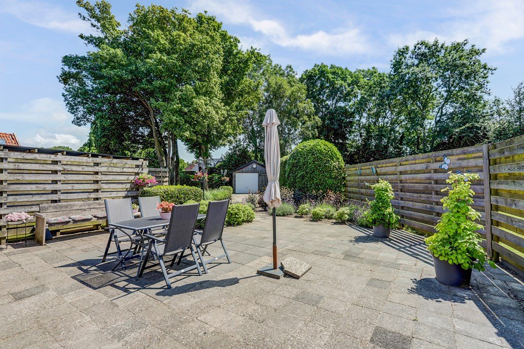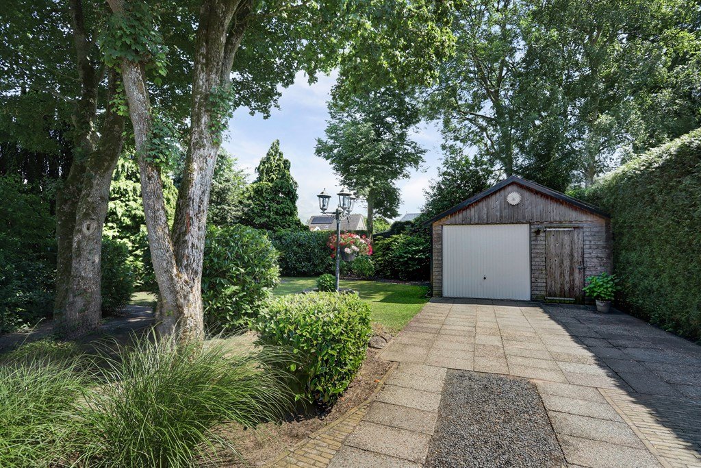 Rondom de woning ligt een prachtige, groene tuin met gazon, struiken en bloeiende borders. Het royale terras nodigt uit tot lange zomerse avonden. Achterin de tuin staat een houten garage/berging van circa 26 m² en er is een bestrate oprit op eigen terrein.