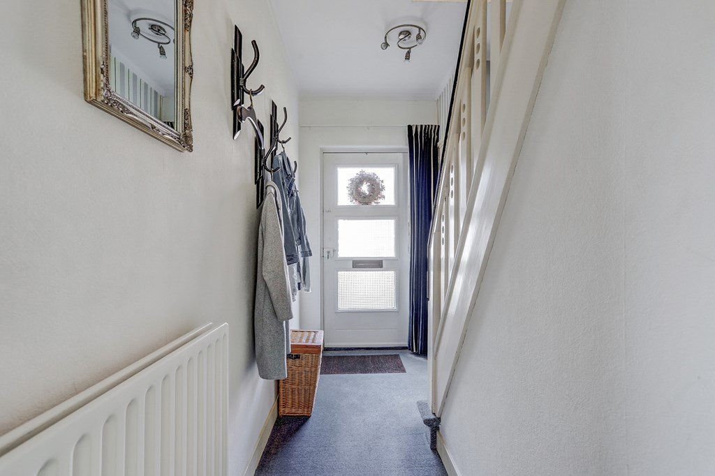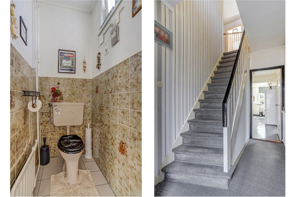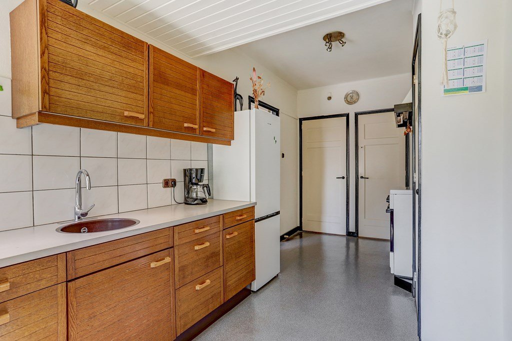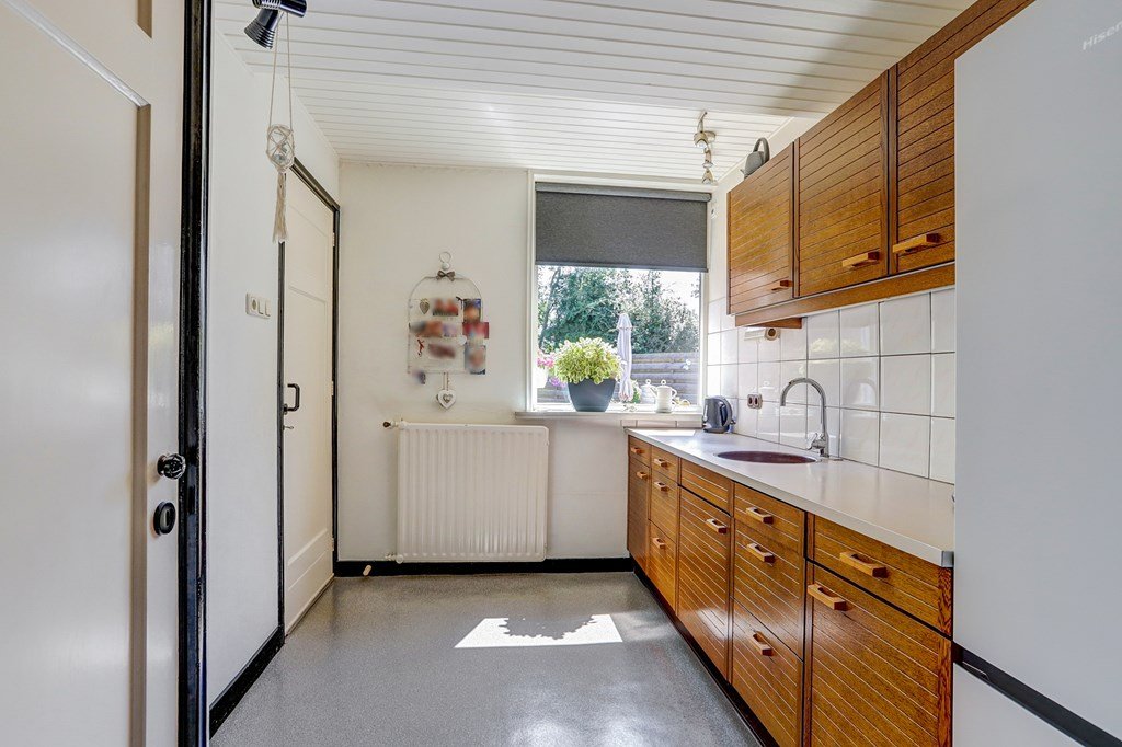 Via de entree en hal komt u in de royale, lichte woonkamer met een prettig zit- en eetgedeelte. Aansluitend bevindt zich de dichte keuken met vaste kasten en keukenopstelling, met toegang tot de droge kelder met stahoogte. Vanuit de keuken is er een doorgang naar de bijkeuken met tuindeuren en een toiletruimte.