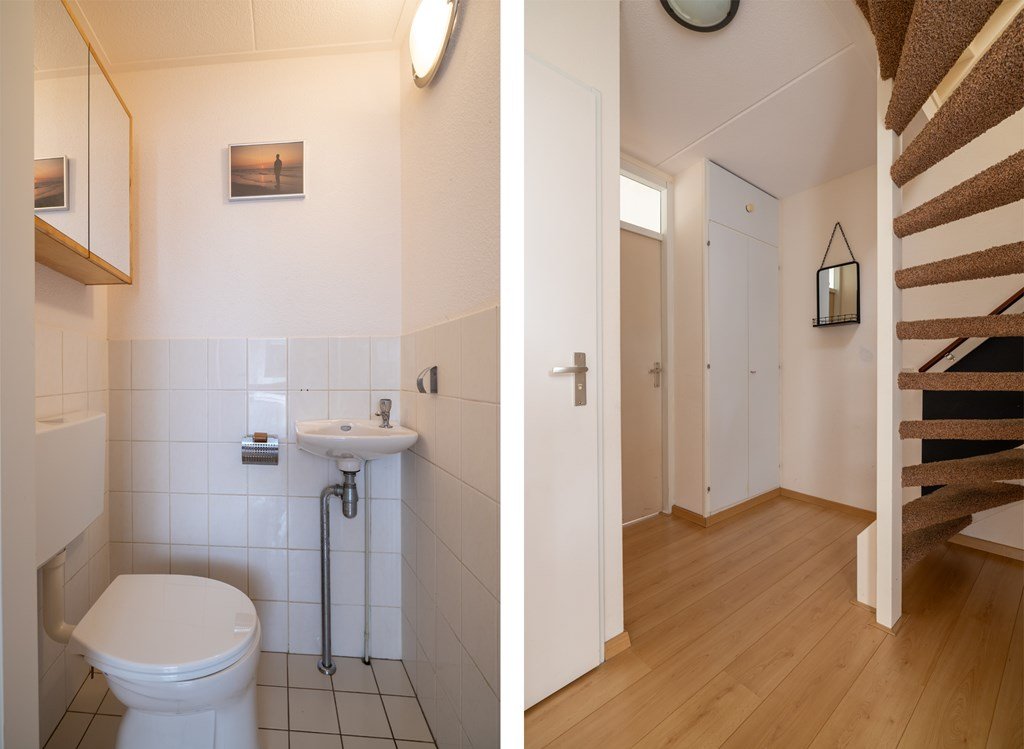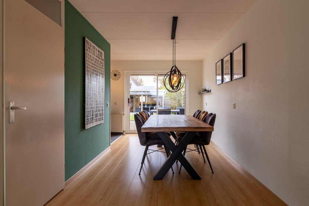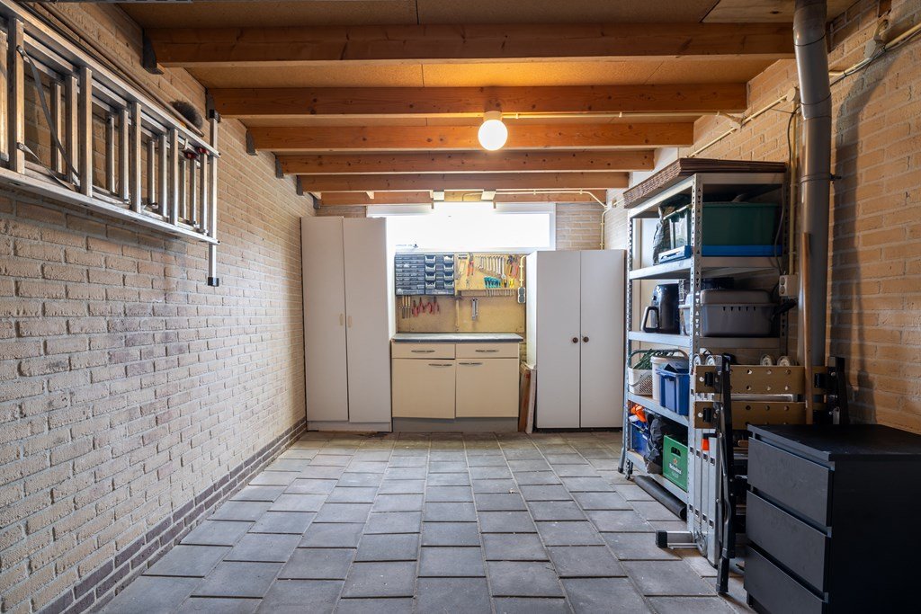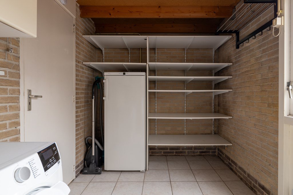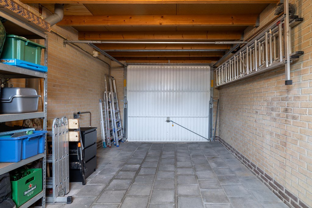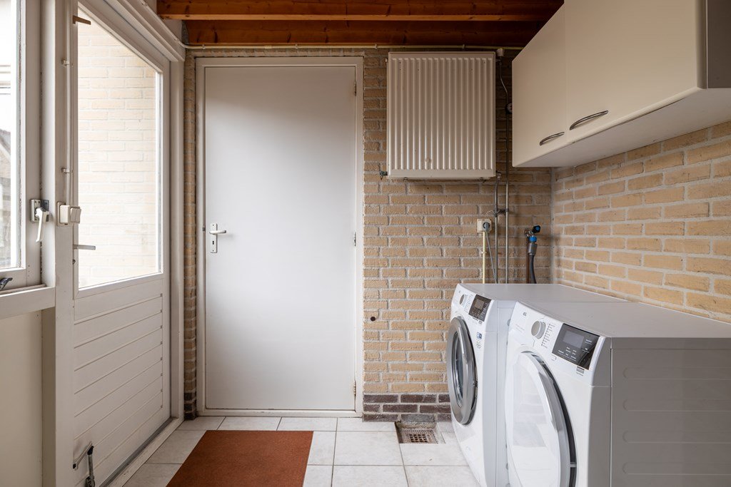 Bij binnenkomst treft u de hal met meterkast, trapopgang naar de eerste verdieping en toegang tot de woonkamer. De woonkamer ligt aan de voorzijde van de woning en biedt een prettige lichtinval. Aan de achterzijde bevindt zich de keuken, voorzien van diverse inbouwapparatuur zoals een combi-oven, gaskooktoestel, koelkast en vaatwasser. Vanuit de keuken bereikt u de bijkeuken met aansluitingen voor wasmachine en droger, toegang tot de achtertuin én de doorgang naar de garage. De ruime garage is ideaal voor het stallen van fietsen of het opbergen van spullen.