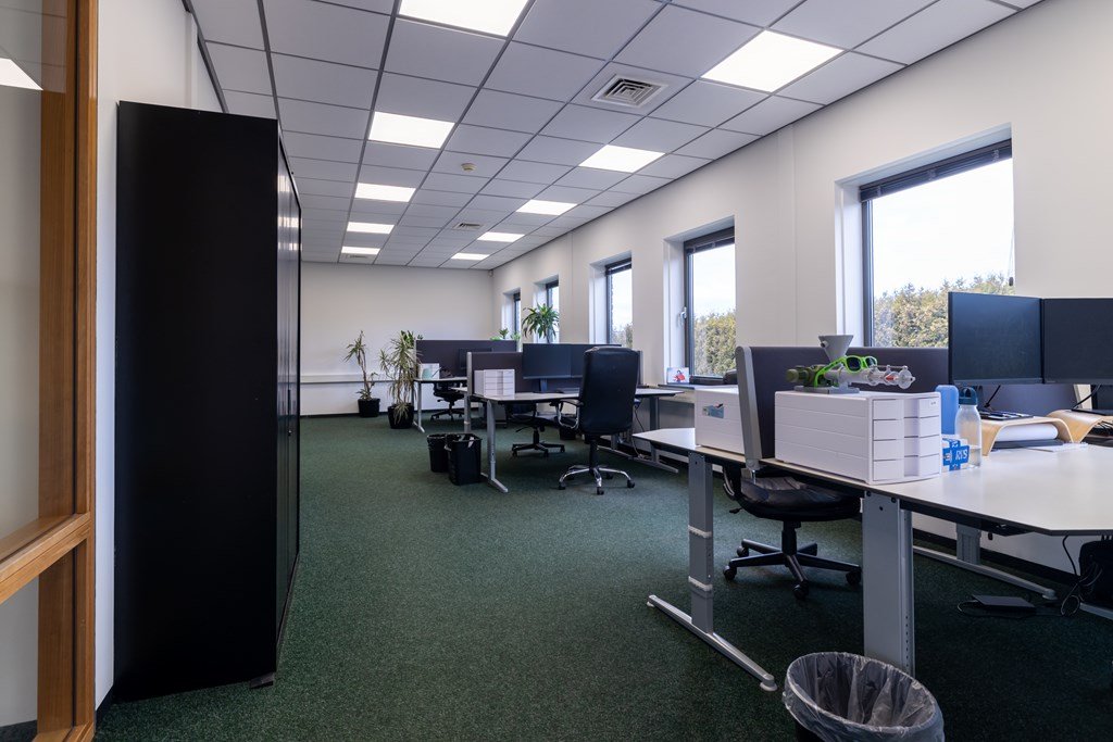 Diverse kantoorruimten, twee spreekkamers en technische ruimten.