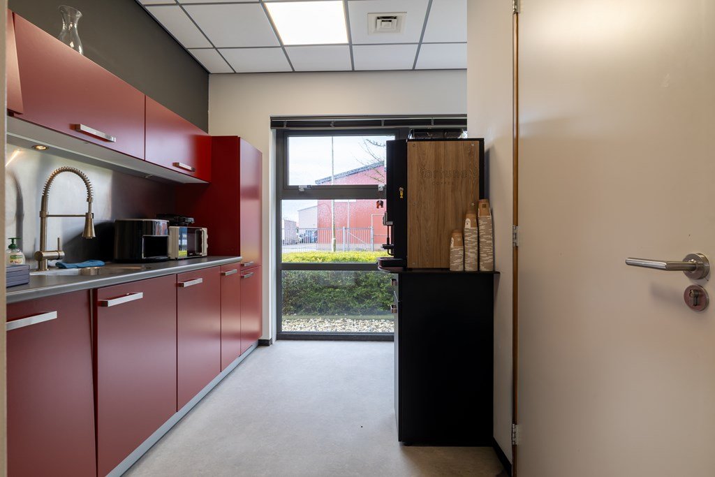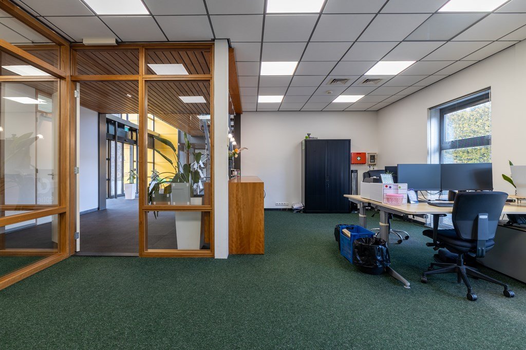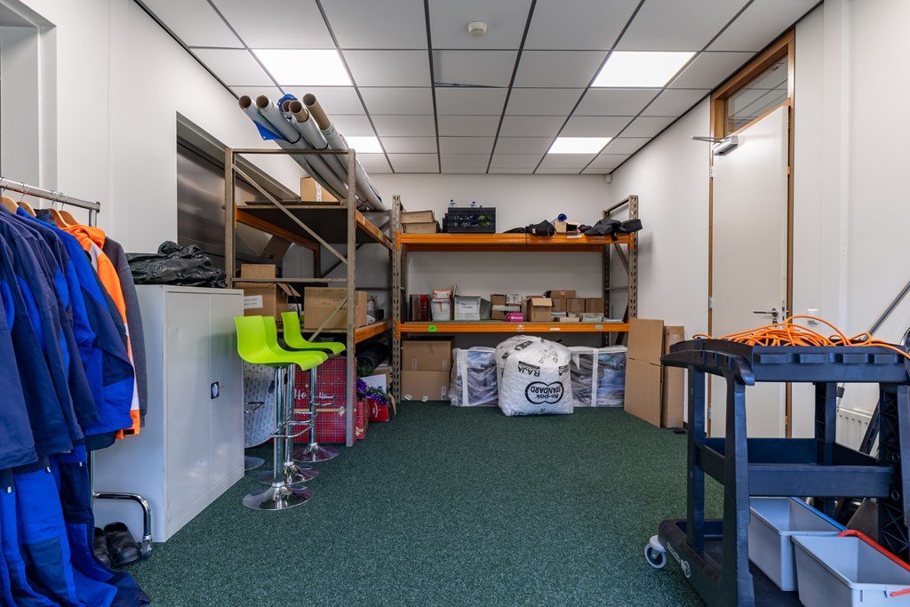 Ruime entree met vide en receptie, diverse kantoorruimten, archiefruimte, kantine-/vergaderruimte, pantry, toiletgroep en werkkast.