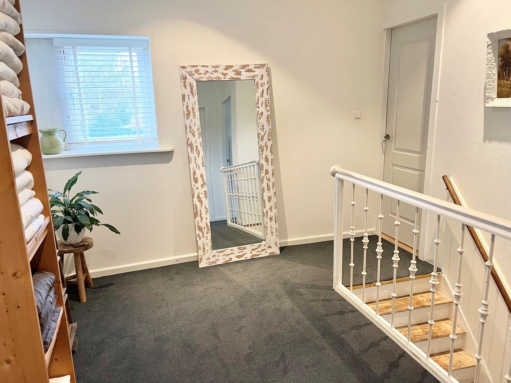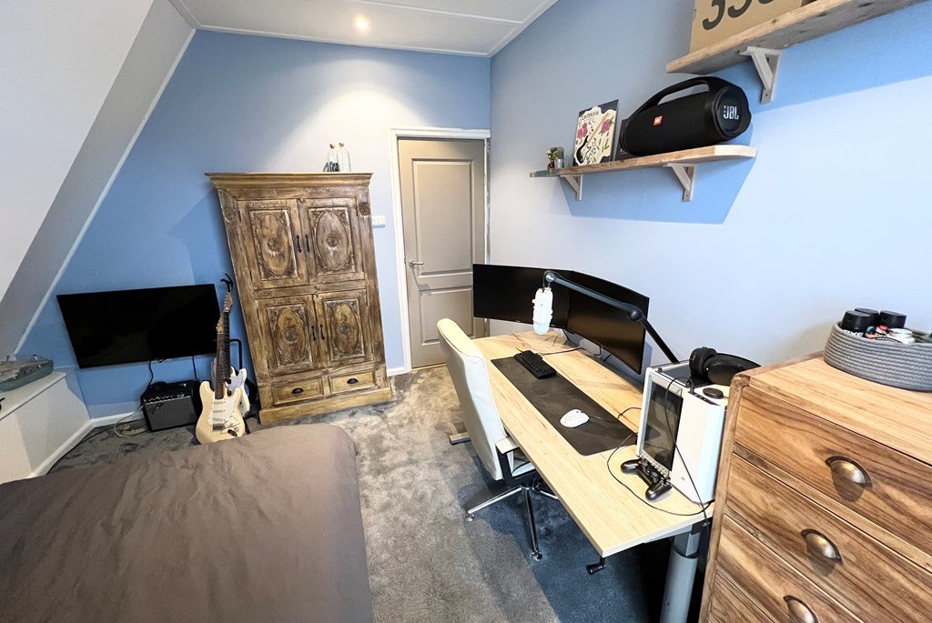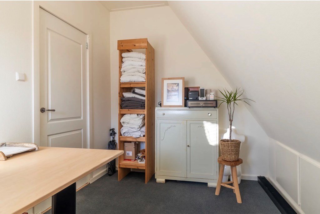 Op de begane grond bevindt zich daarnaast een kantoor-/slaapkamer, waardoor de woning eenvoudig levensloopbestendig te maken is. In combinatie met de aanwezige kastruimte (voormalige badkamer) kan hier relatief eenvoudig een badkamer worden gerealiseerd. De kamer is daarnaast uitermate geschikt als praktijkruimte, atelier of thuiswerkplek.