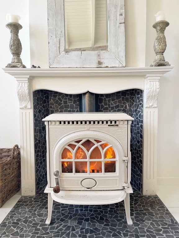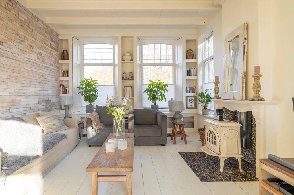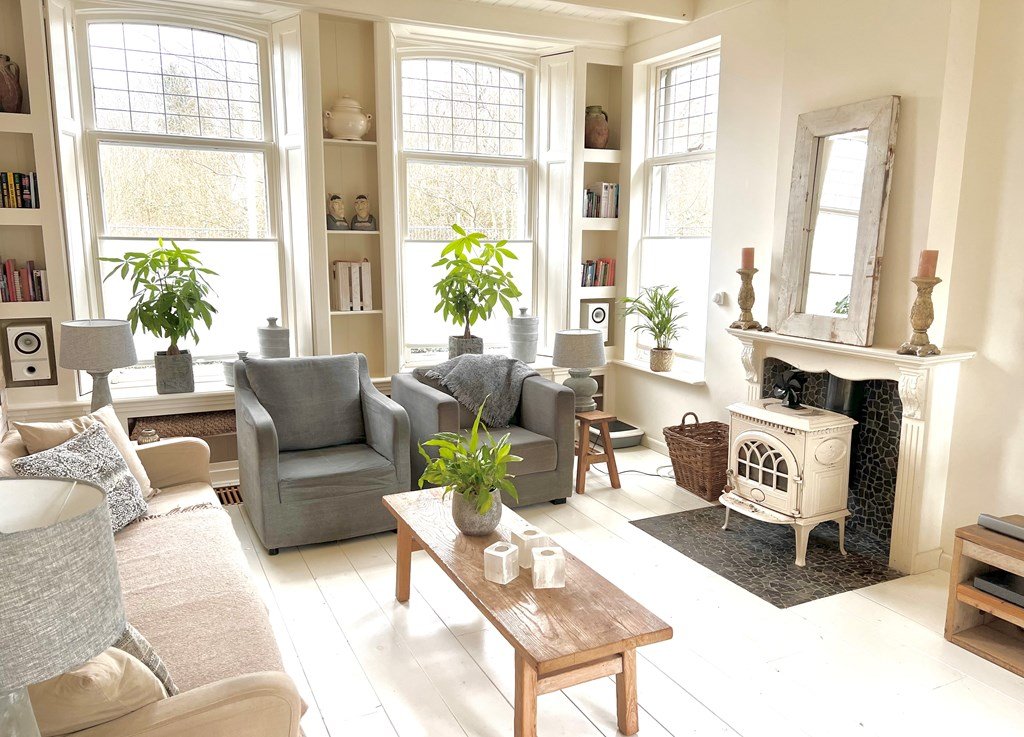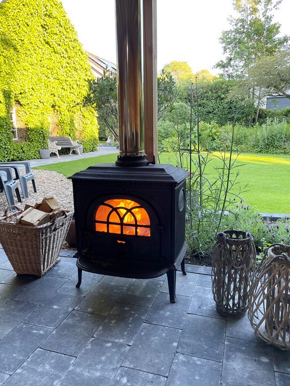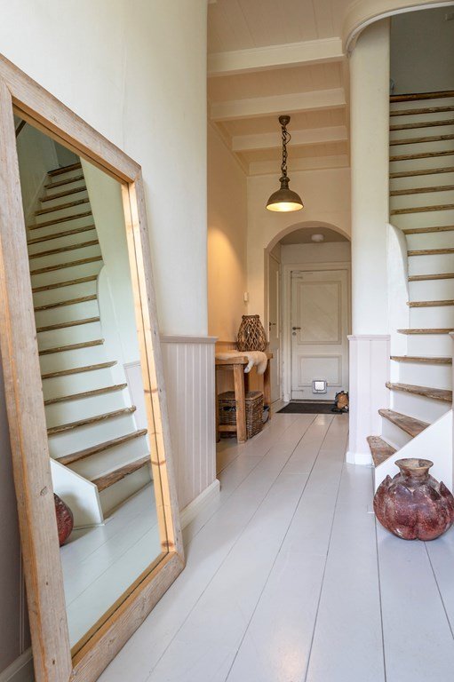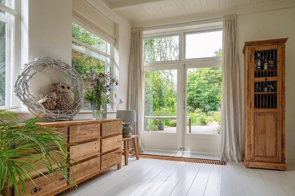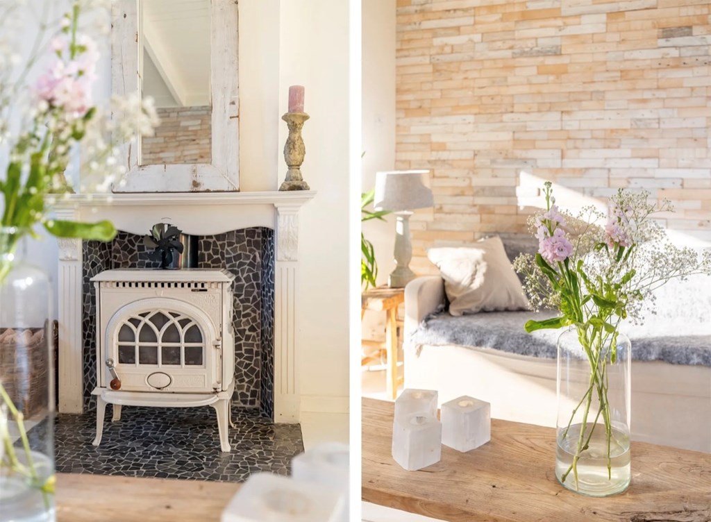 Binnen treft u een woning vol authentieke details en een warme, stijlvolle sfeer. De woonkamer is licht en ruim opgezet en profiteert van veel natuurlijke lichtinval. In de winter zorgt de houtkachel voor een knusse ambiance, terwijl in het voorjaar en de zomer de openslaande deuren de woonkamer verbinden met de tuin.