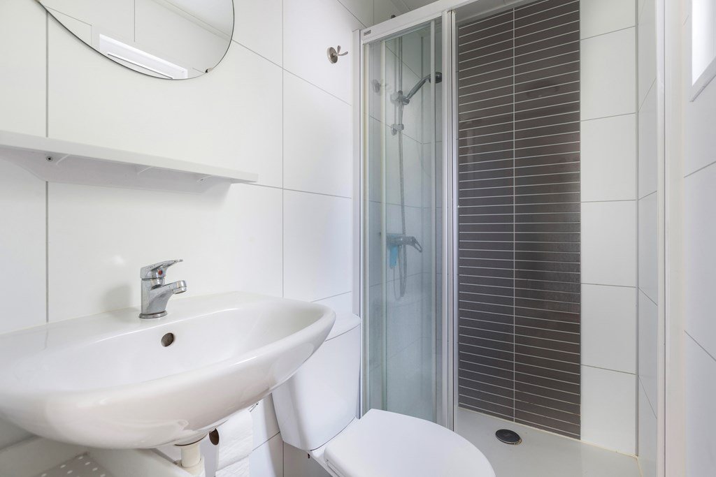 • Badkamer met wastafel, douche en toilet