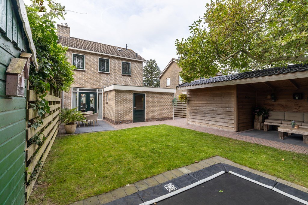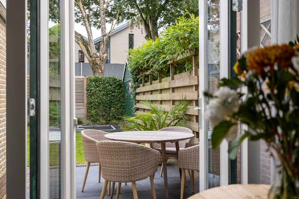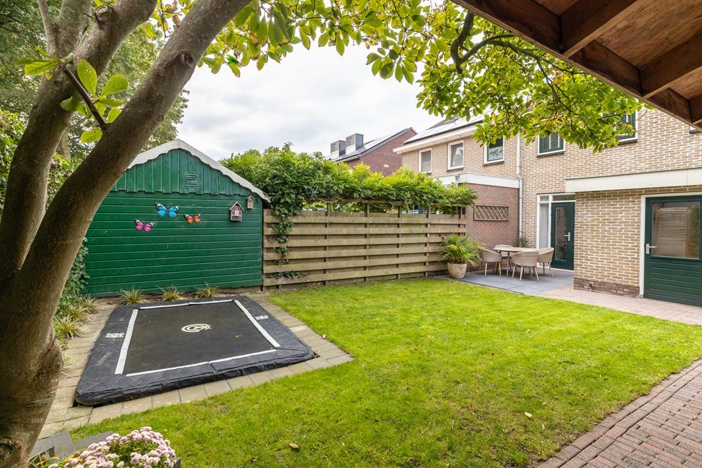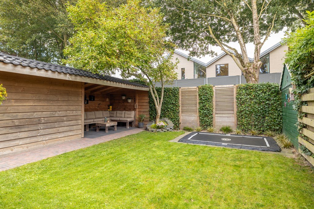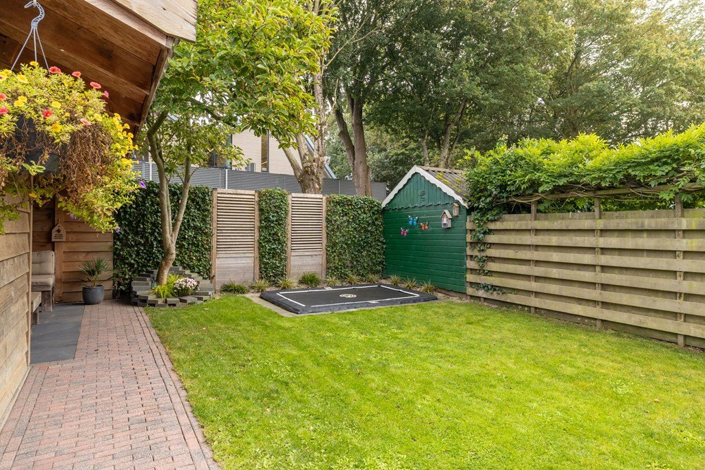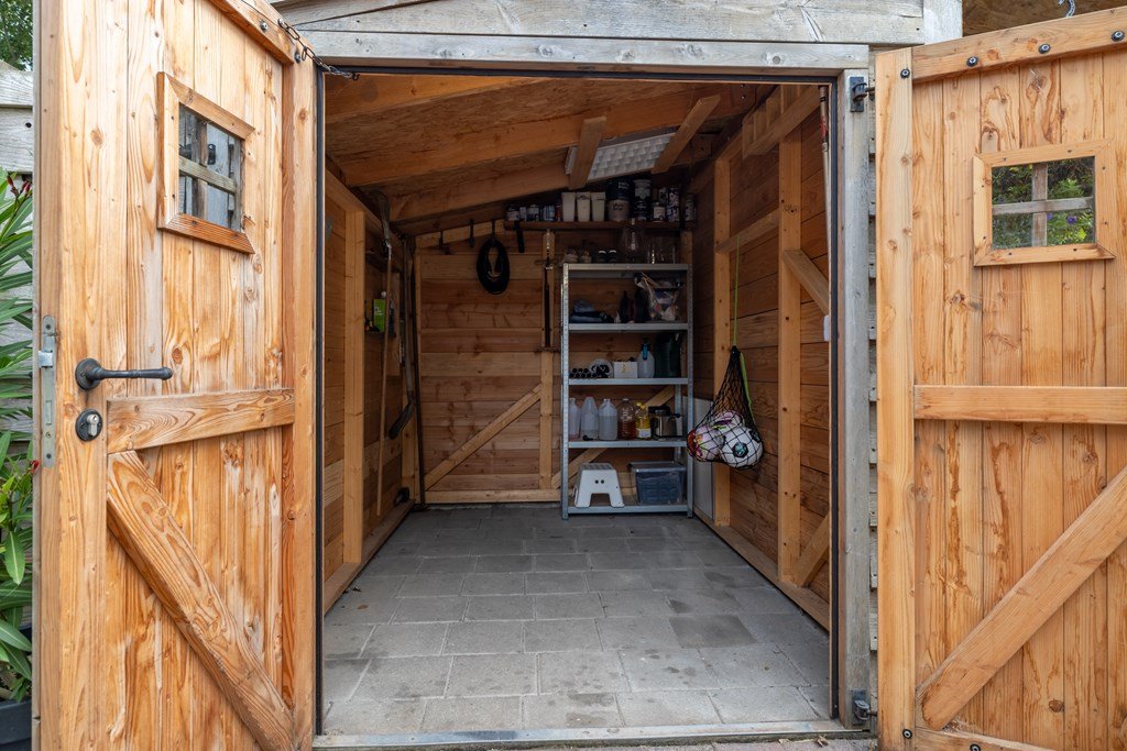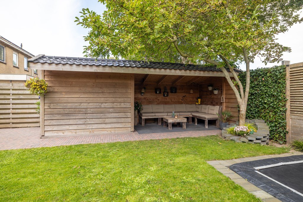 De zonnige tuin, gelegen op het zuidoosten, is deels betegeld en deels voorzien van een gazon. Omdat de zon rondom de woning draait, vind je op elk moment van de dag een fijn plekje in de zon. Daarbij is er een overkapping geplaatst in de tuin waar je heerlijk onder kunt vertoeven. In de berging is ruimte voor fietsen en tuingereedschap.