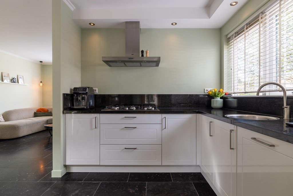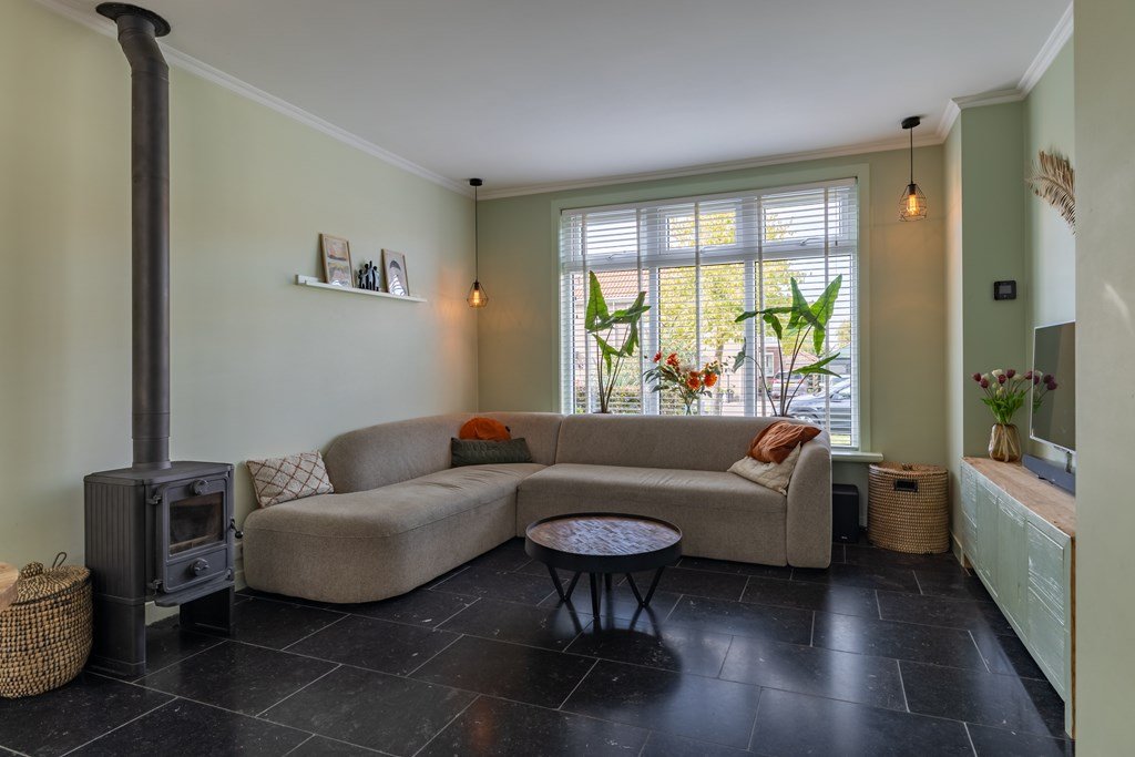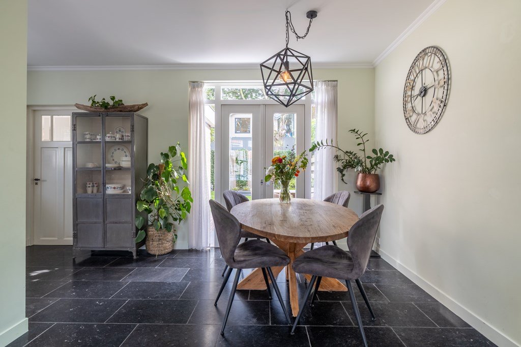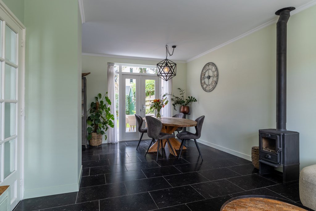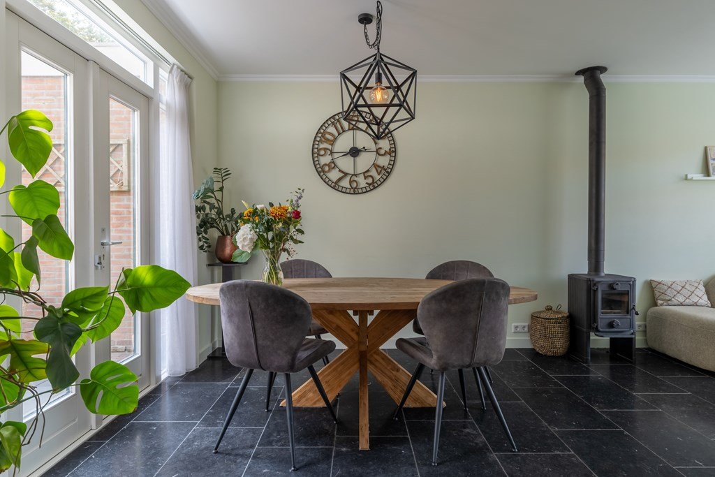De woonkamer en eetkamer vormen één sfeervolle, open ruimte. De gehele begane grond is uitgerust met vloerverwarming, wat zorgt voor optimaal wooncomfort. Bij de eettafel vind je nog openslaande deuren naar de tuin.