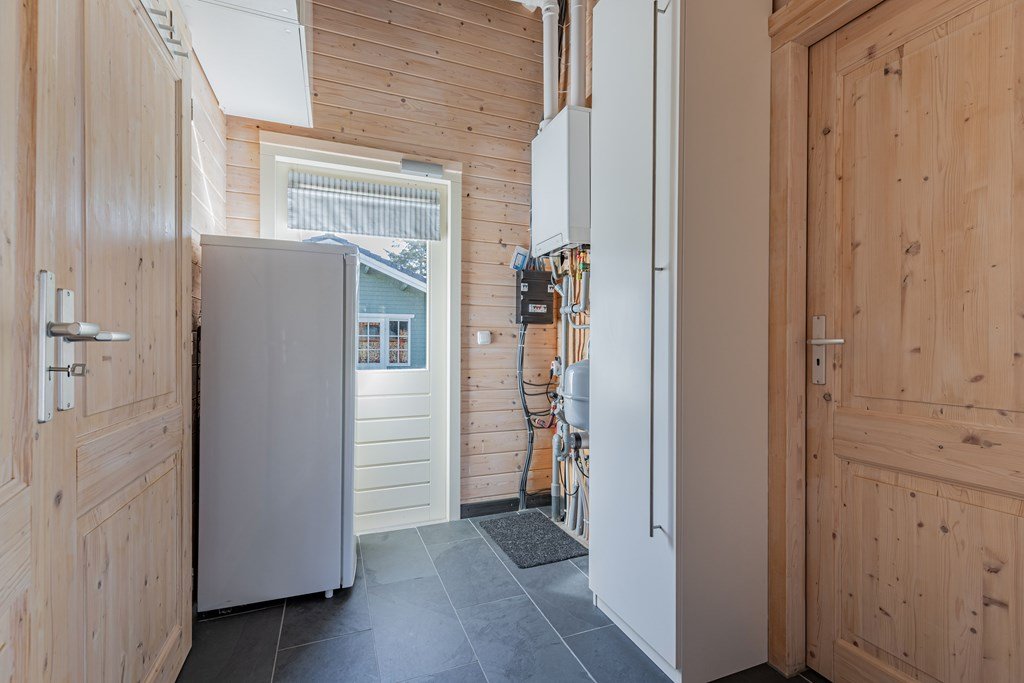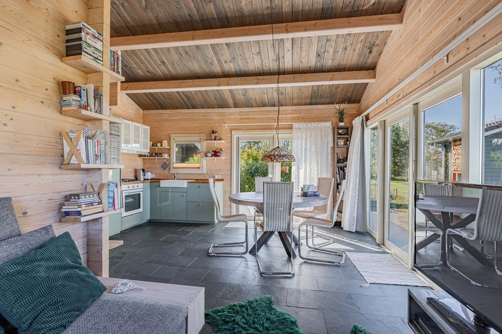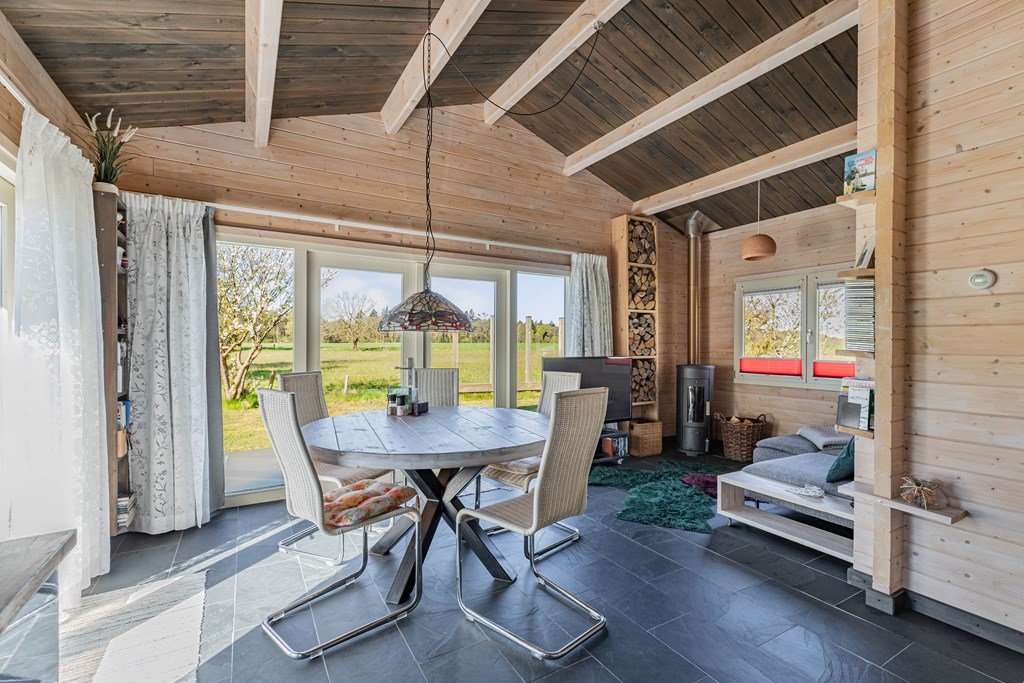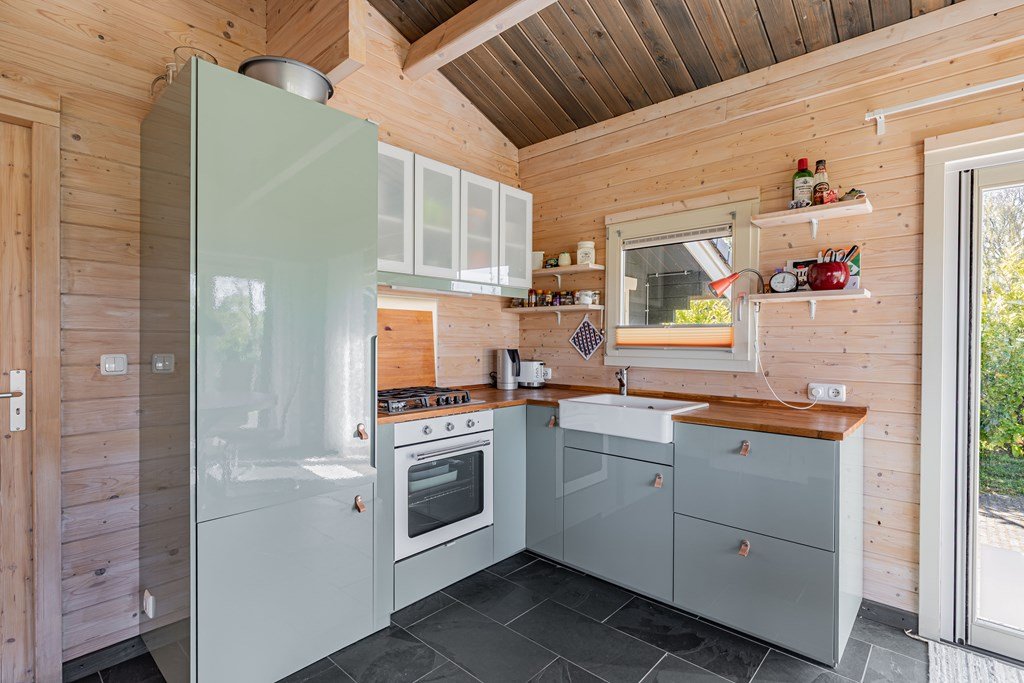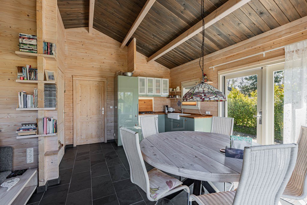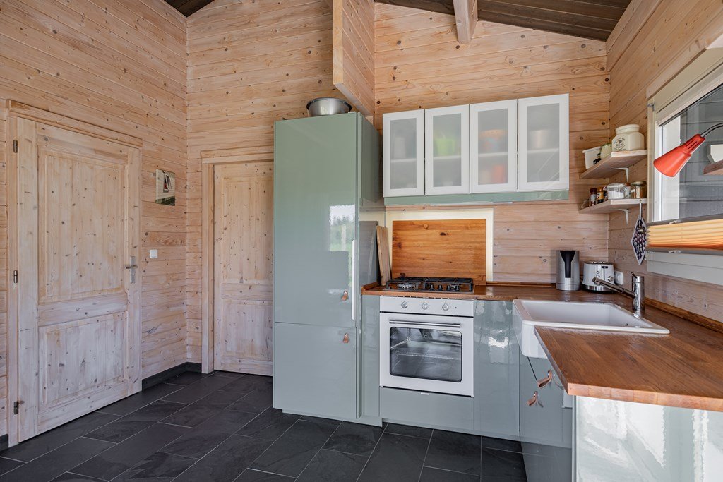 Binnen treft u een lichte woonkamer met open keuken. De houtkachel en de vloerverwarming zorgen samen voor een comfortabel en aangenaam binnenklimaat.