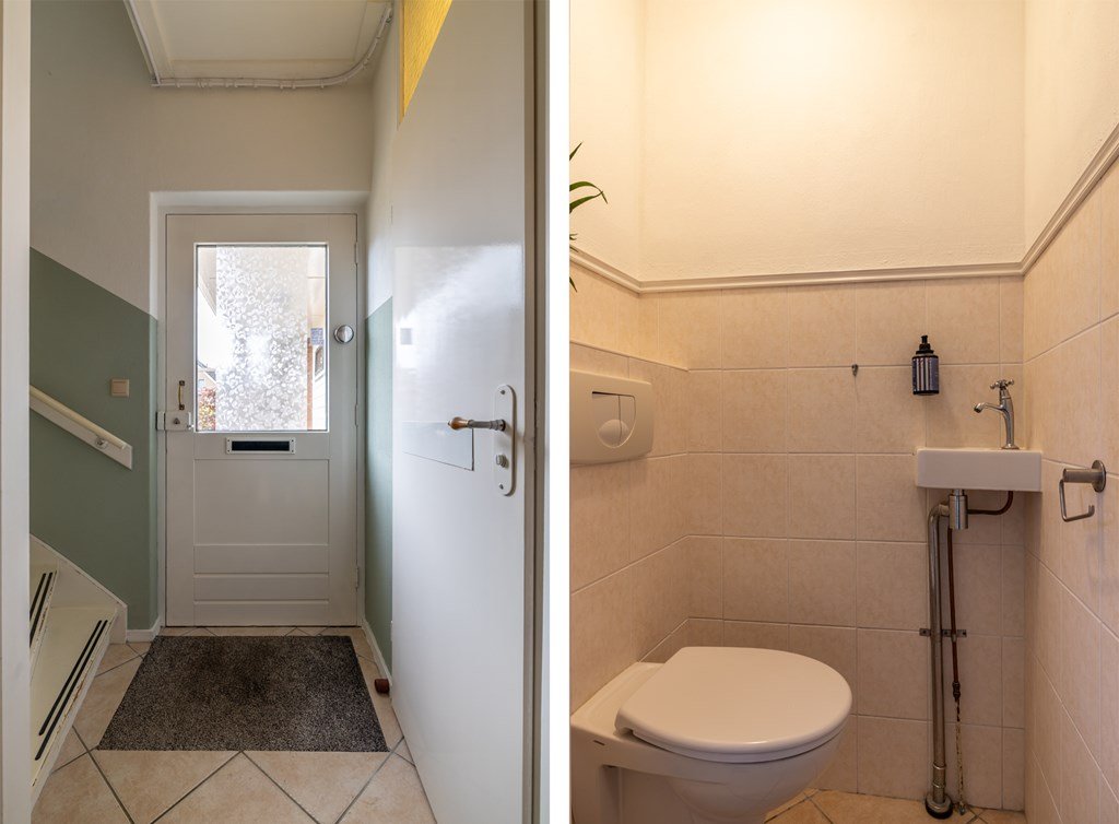 Via de entree betreedt u de hal met toilet, meterkast en trapopgang. De lichte woonkamer biedt volop leefruimte voor een gezellige zithoek en een royale eettafel. De keuken is uitgevoerd met een kunststof aanrechtblad en voorzien van een inductiekookplaat en inbouwkoelkast. In de praktische bijkeuken vindt u de koelkast en een losstaande vaatwasser, evenals extra bergruimte en de doorgang naar buiten.