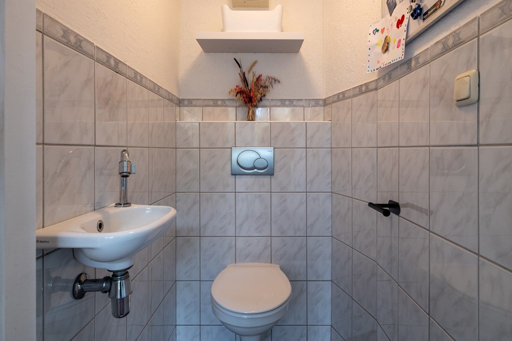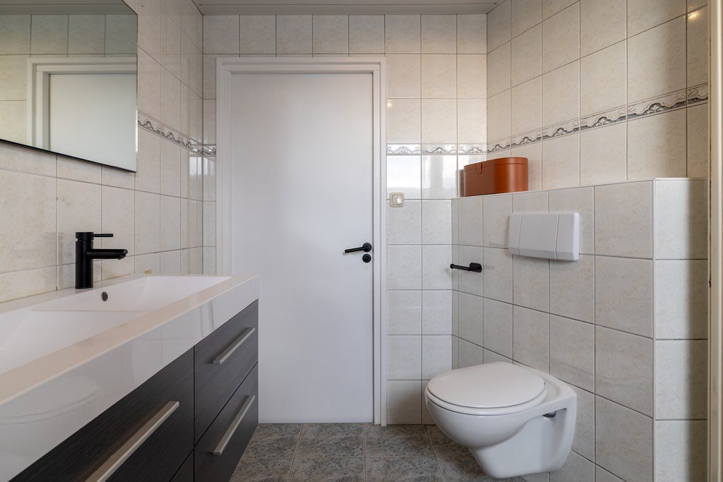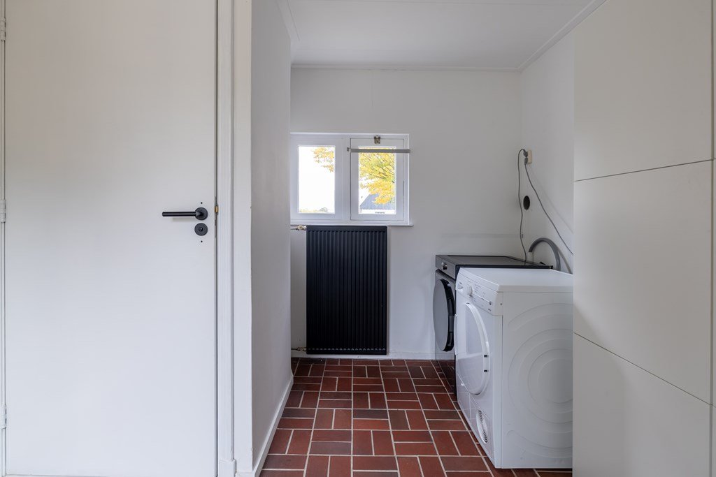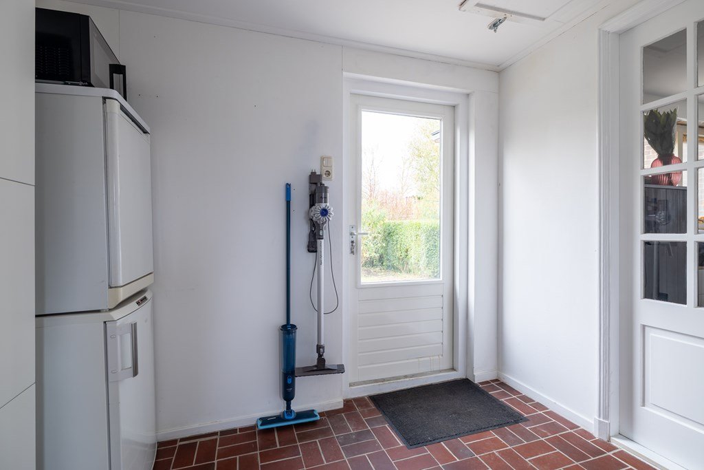 In de bijkeuken vind je de aansluitingen voor wasmachine en droger, het toilet, een vlizotrap naar de vliering en de deur naar de tuin.