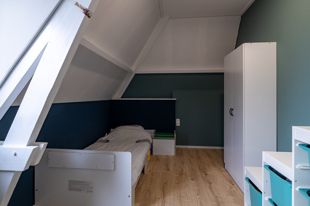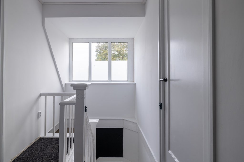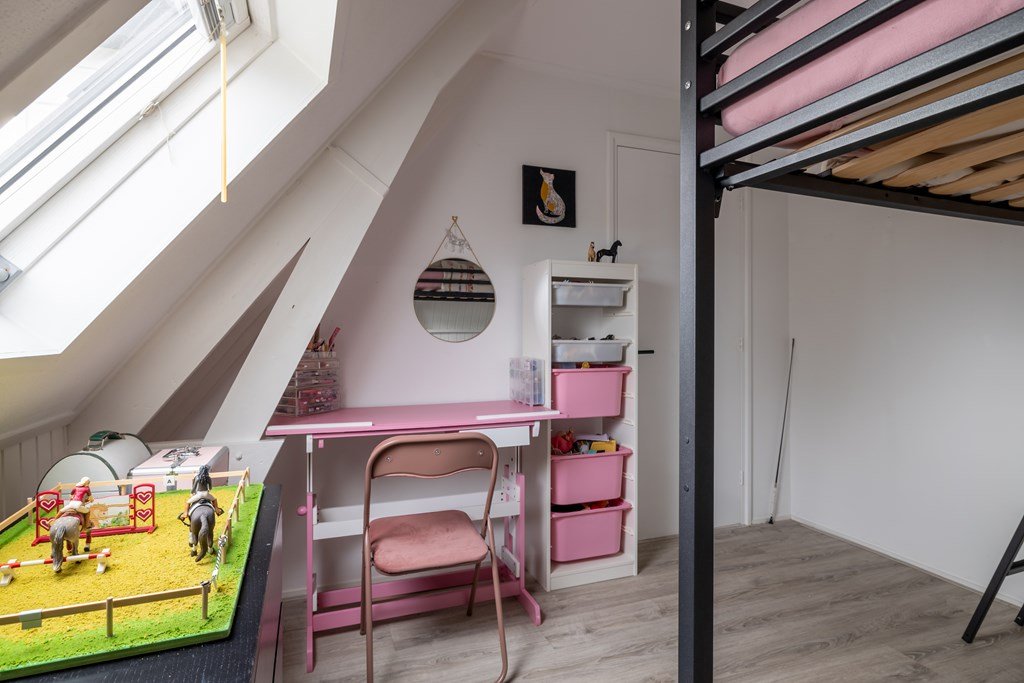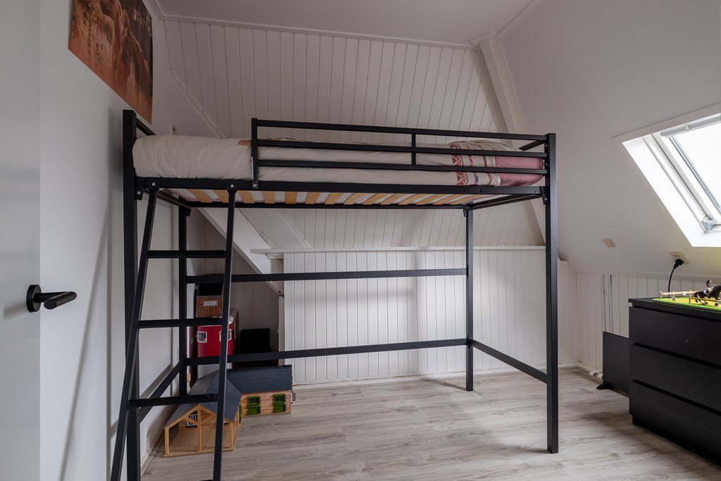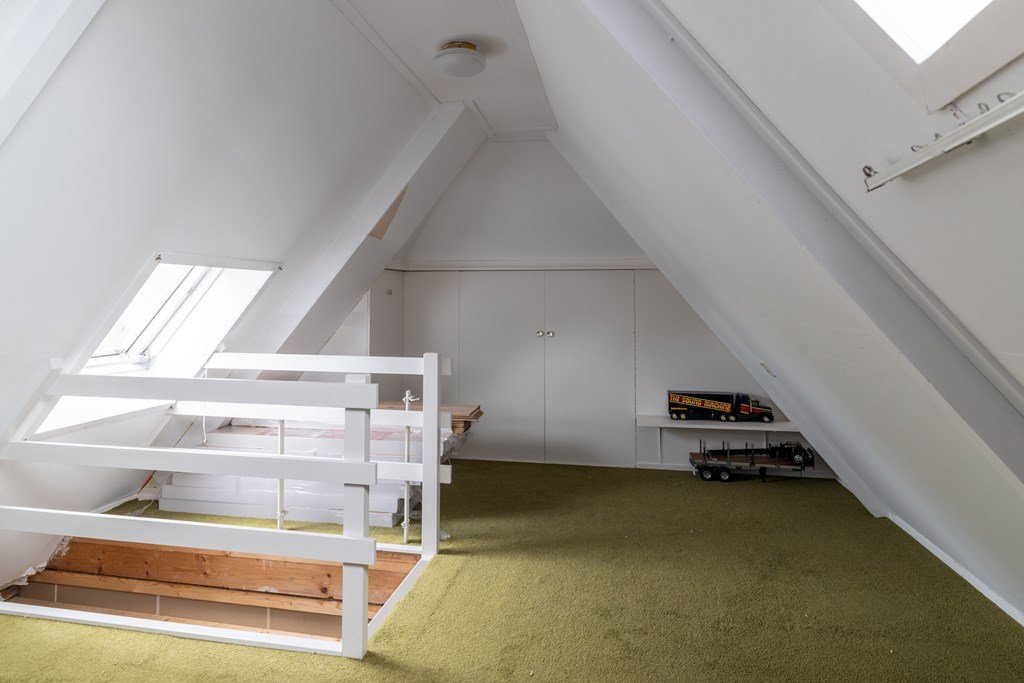 Op de bovenverdieping vind je een ruime overloop, vier royale slaapkamers en een nette badkamer. Via een vaste trap bereik je de zolder – handig voor extra opslag.