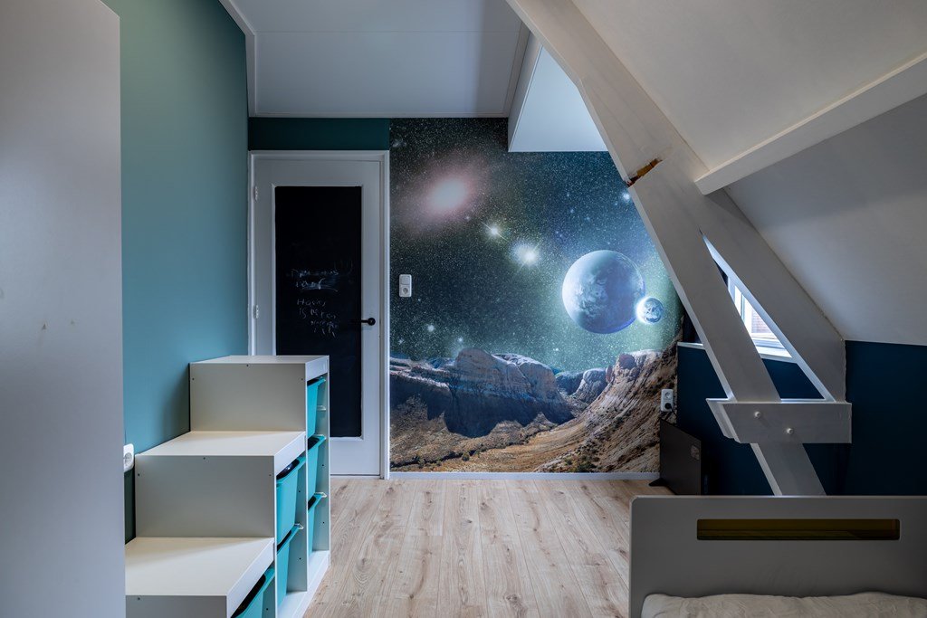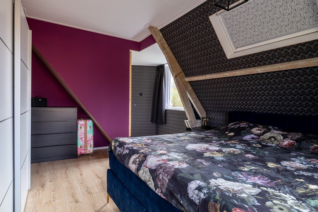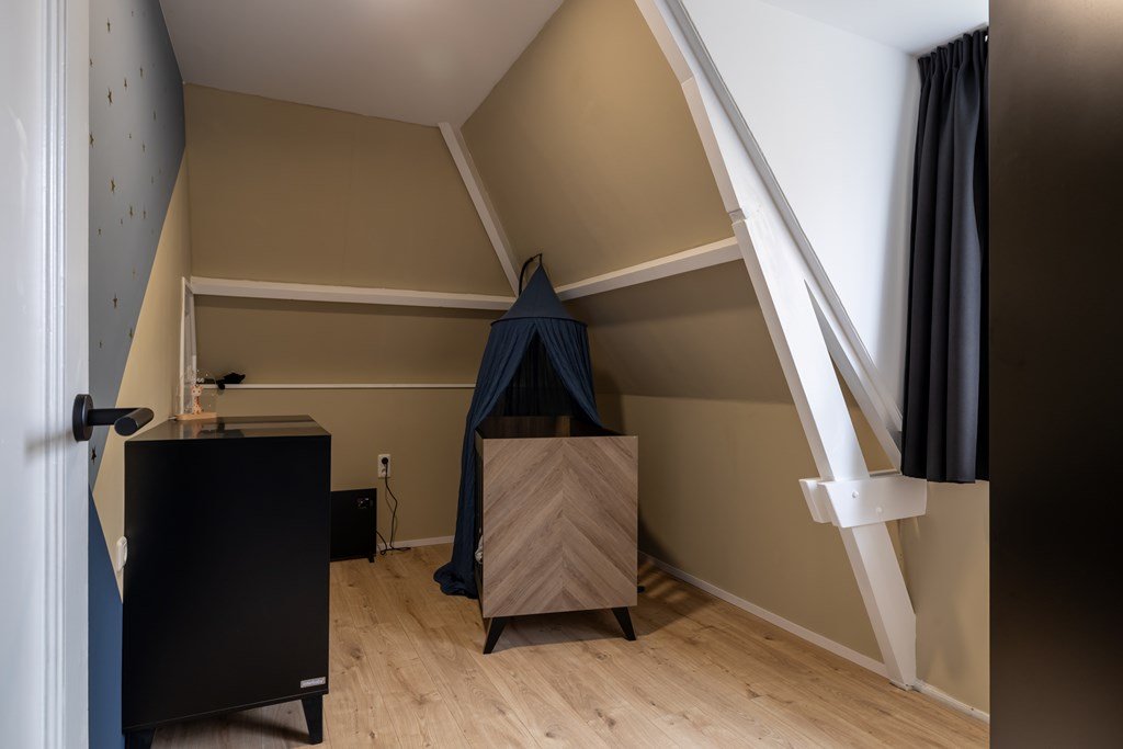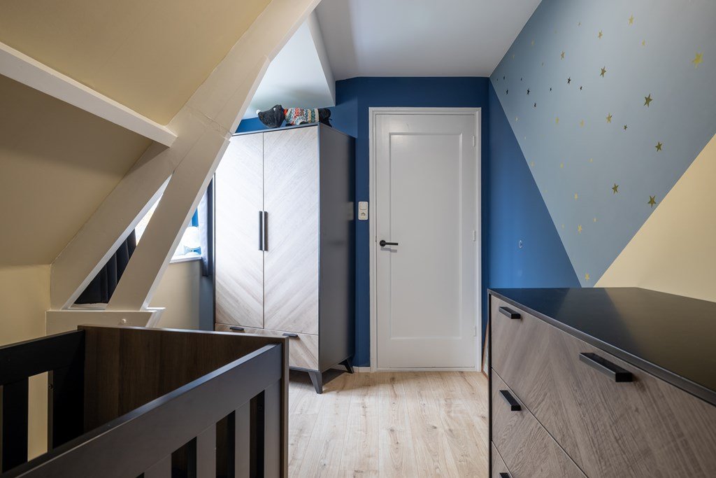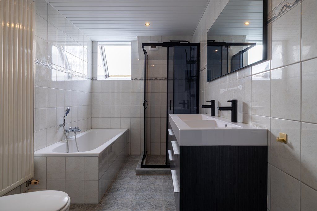 Op de bovenverdieping vind je een ruime overloop, vier royale slaapkamers en een nette badkamer. Via een vaste trap bereik je de zolder – handig voor extra opslag.