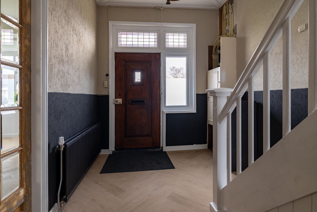 Zodra je binnenstapt, proef je de sfeer van de jaren ’30. De prachtige hoge plafonds, de authentieke details en de stijlvolle visgraatvloer geven direct een warm welkom. In de hal vind je de meterkast, garderobe, de trapopgang en de deur naar de living.