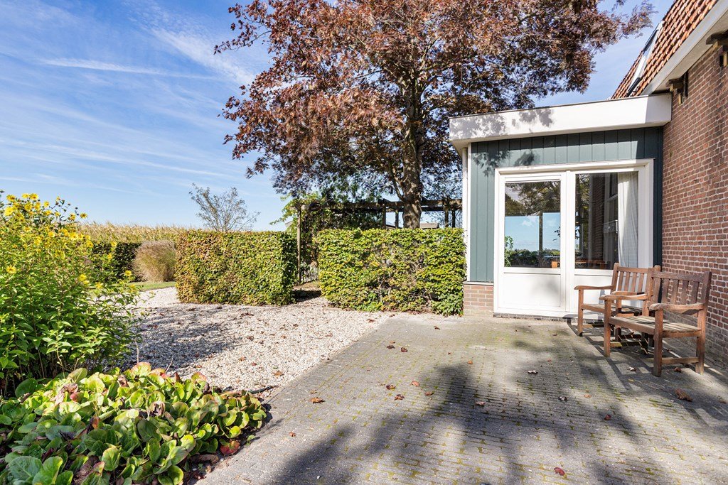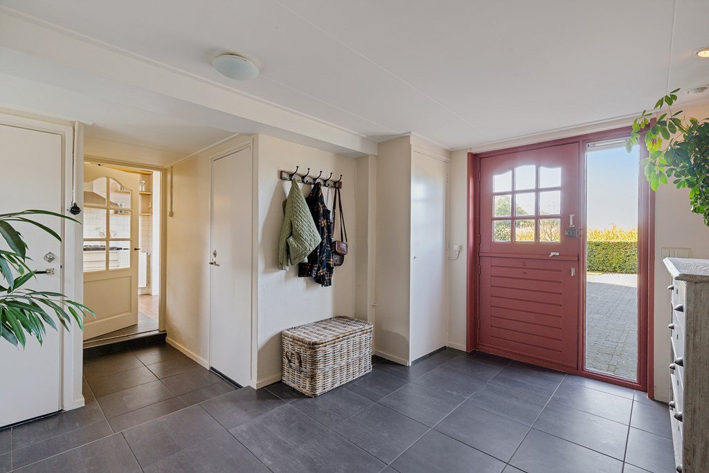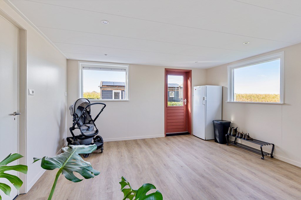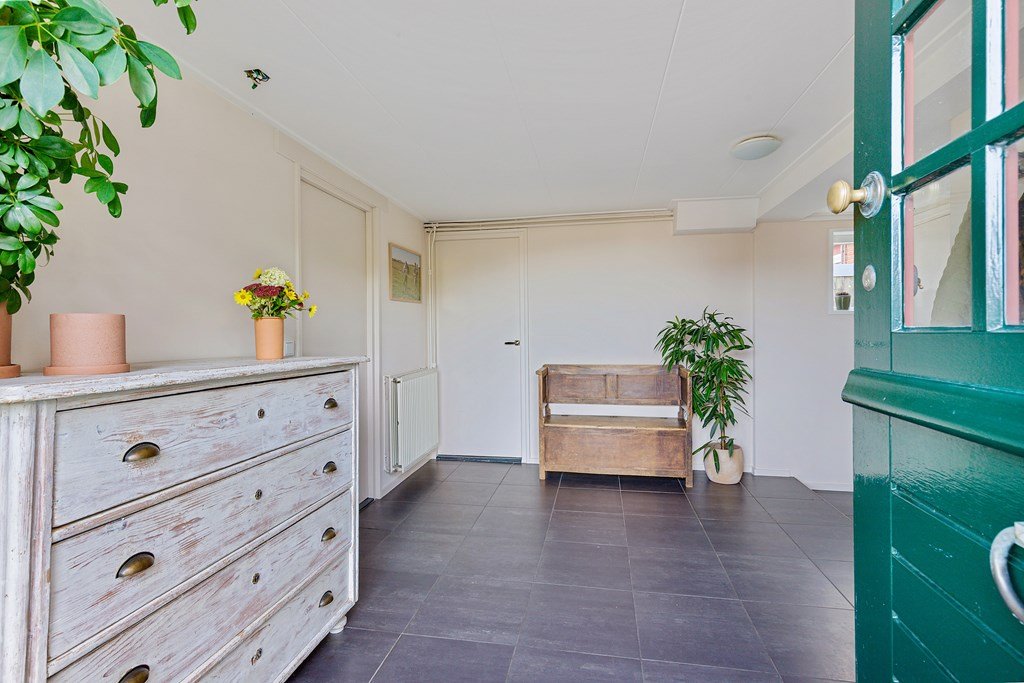 Via de zij-entree komt u binnen in de hal met toegang tot het toilet, de badkamer, de bijkeuken, de living en de aanbouw aan de achterzijde. Deze aanbouw biedt volop mogelijkheden — denk aan een kantoor aan huis, extra woonkamer of zelfs een aanleunwoning.
