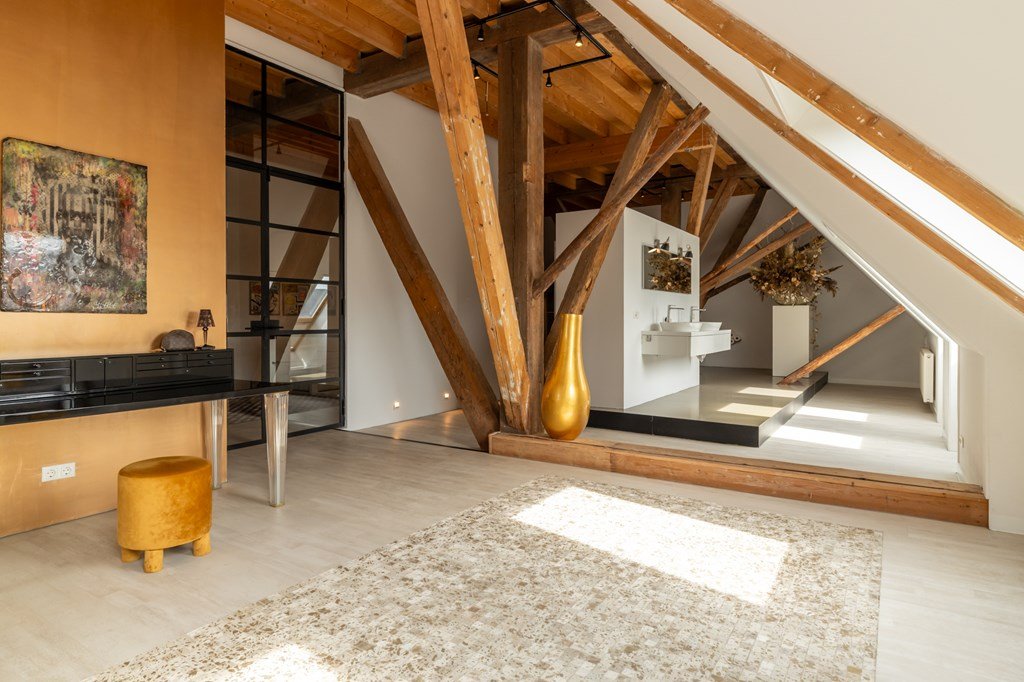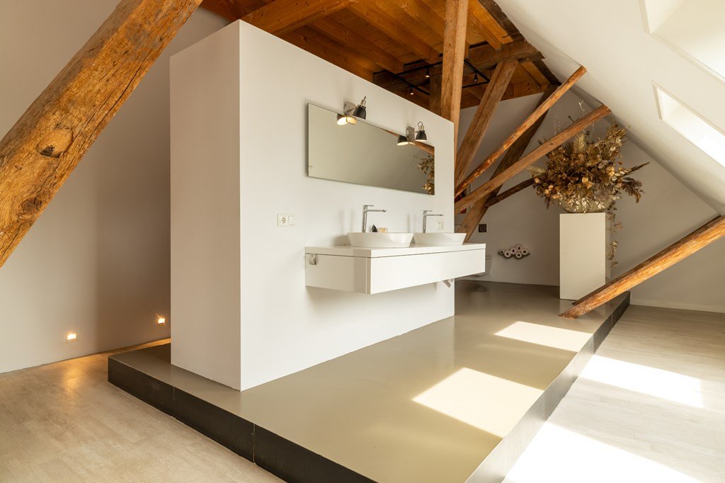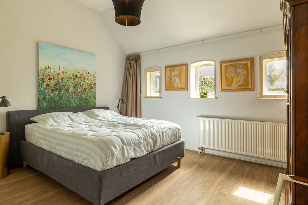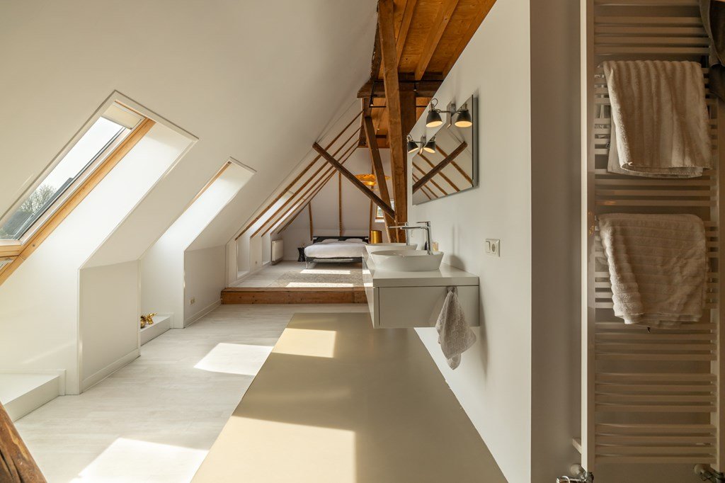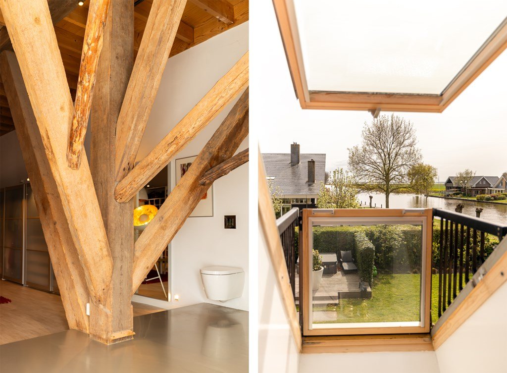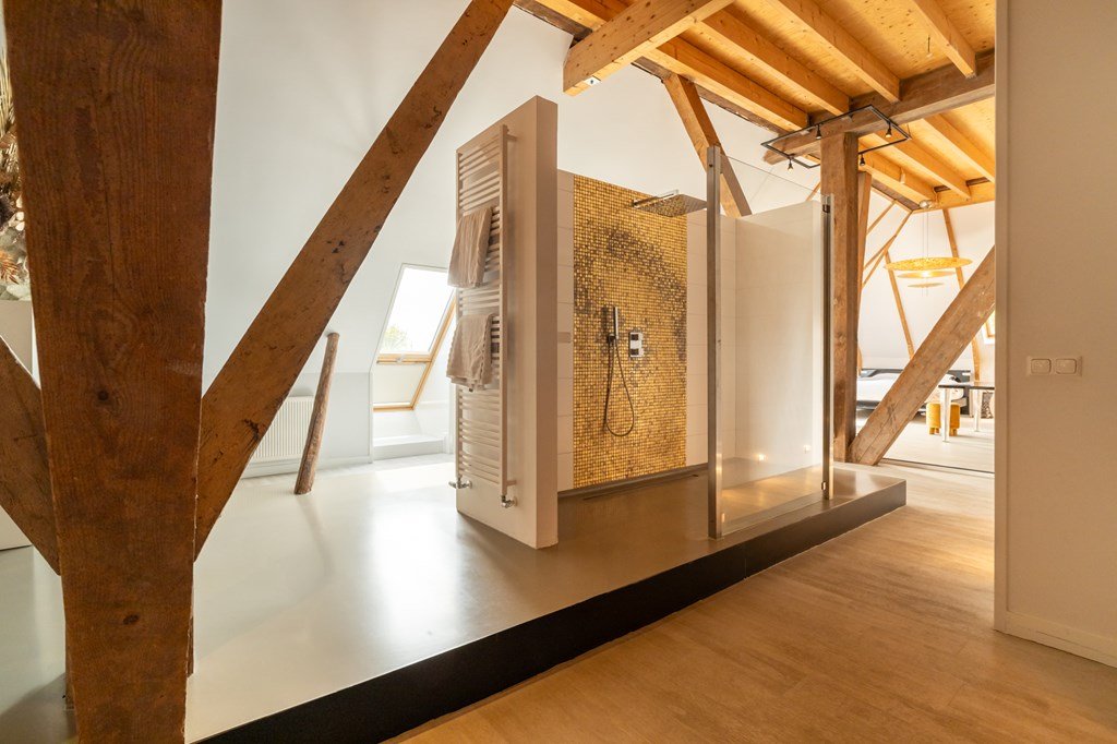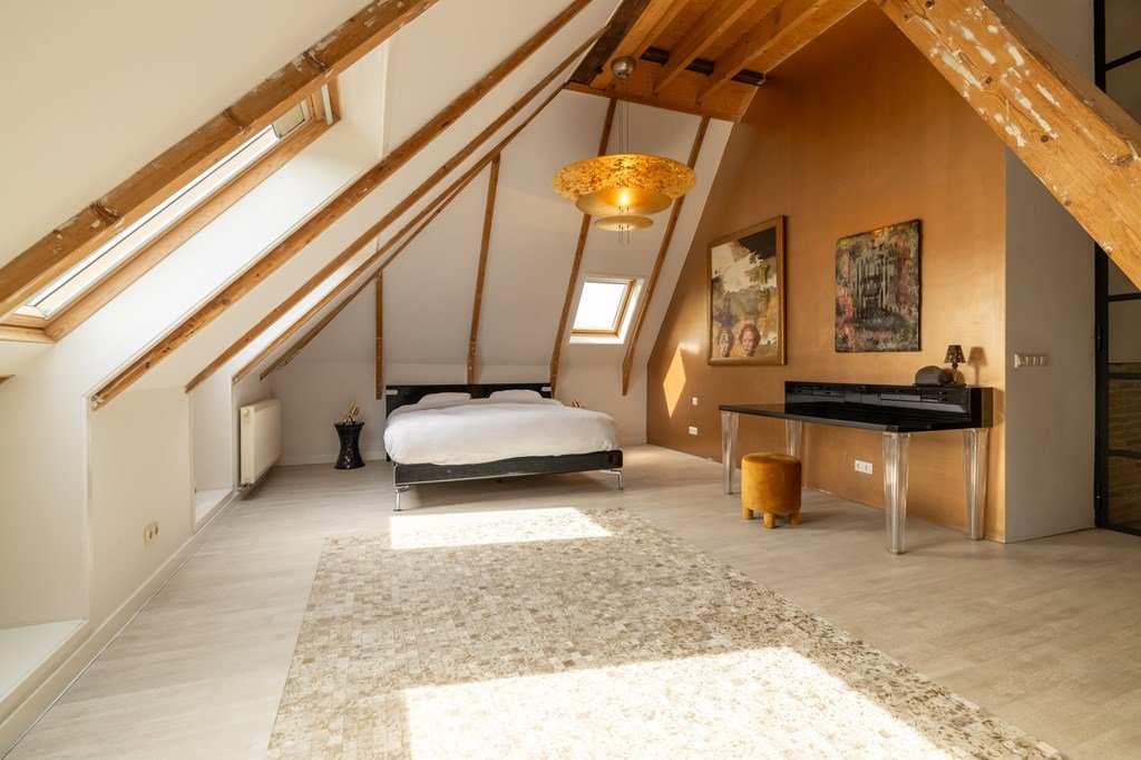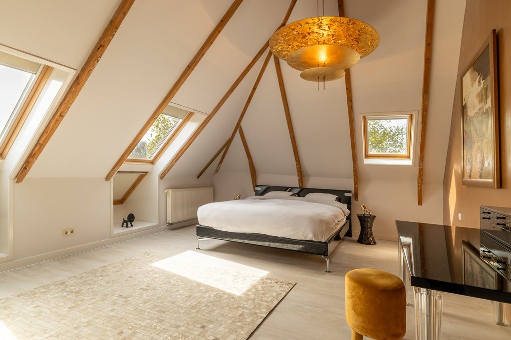 De eerste verdieping is werkelijk een blikvanger en zorgt direct voor dat echte wauw-effect. Hier vindt u meerdere slaapkamers, een royale walk-in closet – een droom voor velen – en een stijlvolle, open badkamer. Deze is uitgerust met een dubbele wastafel en een vrijstaande rainshower, prachtig gepositioneerd tussen de authentieke, karakteristieke binten van de boerderij. Deze verdieping beschikt ook over meerdere lichtvensters, waaronder twee karakteristieke balkonvensters met een weids uitzicht over het Slotermeer. Deze verdieping biedt volop mogelijkheden voor het realiseren van extra (slaap)kamers.