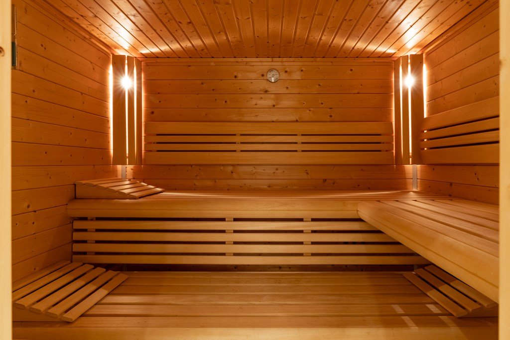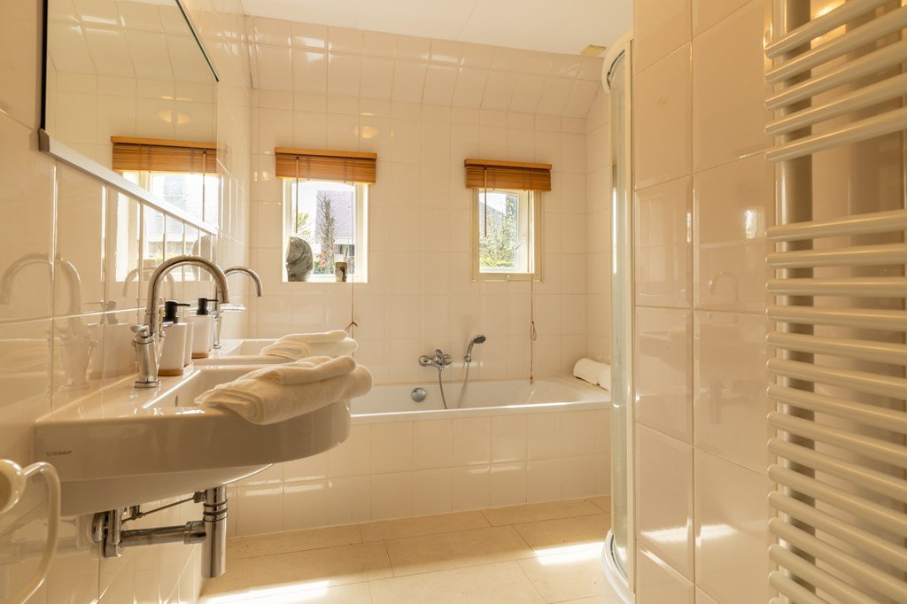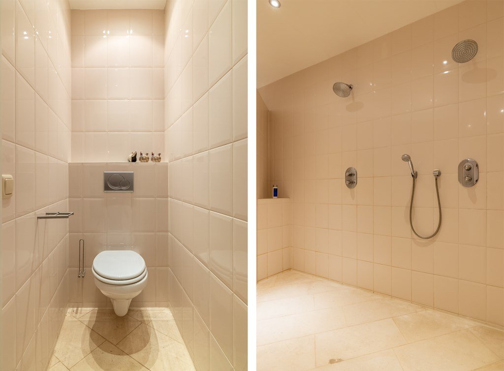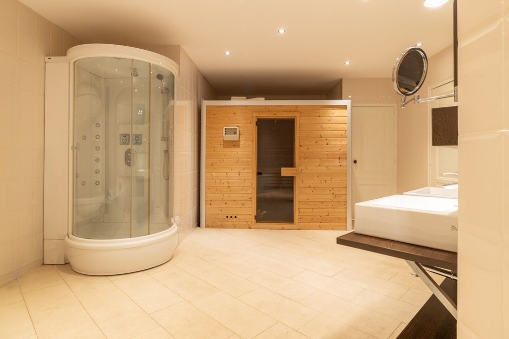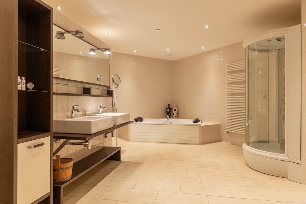 Op de begande grond bevinden zich twee royale slaapkamers en een luxe badkamer, compleet met duo-douche, dubbele wastafel, toilet en een uitgebreide wellnessopstelling met whirlpool, stoomcabine en sauna.