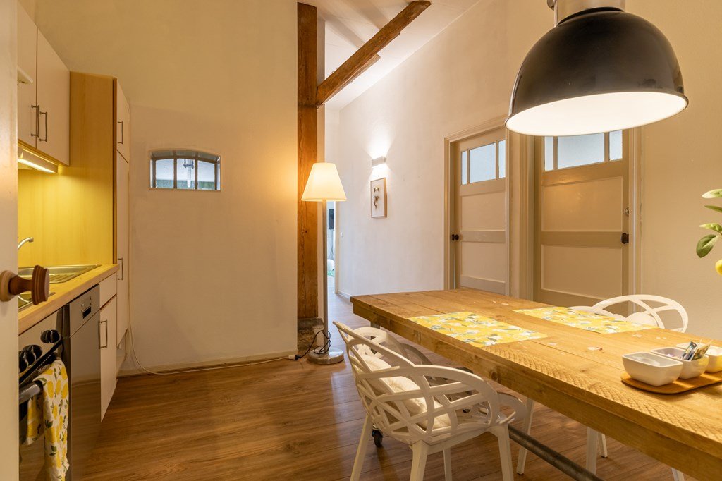 Achter in de boerderij bevindt zich een volledig ingericht gastenverblijf, uitermate geschikt voor gebruik als bed & breakfast maar ook voor inwonenden of andere doeleinden. Het beschikt over een woonkamer, complete keuken, slaapkamer en een badkamer met ligbad, douche, dubbele wastafel en separaat toilet. Dit inpandige appartement beschikt ook over een eigen deel van de tuin.